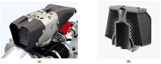 Al alloys have also been employed in the AM of lattice structured cooling systems of combustion engines. One example is the AlSi10Mg microturbine generator housing manufactured by nTopology and Cobra Aero (Figure 3a,b) [38]. The manufacturers showed a 50% reduction in waste material and the possibility to produce the system in one single component, instead of the six parts required in traditional manufacturing.