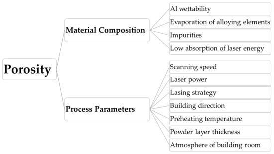 Components made of Al alloys and manufactured by AM always exhibit a certain degree of porosity. The elimination of porosity is a challenging task, because it is related to both material composition and process parameters (see Figure 4); thus, the optimization of the characteristics of printed components involves the trade-off of different factors.