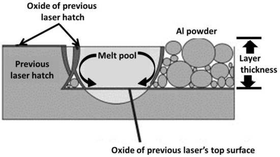 Material properties such as wettability, evaporation of alloying elements, presence of impurities in the liquid pool, and absorptivity of laser beam directly depend on the alloy composition. The manufacturing of a part by L-PBF can be considered as the movement of a melt pool across the surface, with powder at the front of the pool and solidified material at the back. The underlying and surrounding solid partially remelts, so that these regions are wet and fuse with the melt pool. In the case of Al alloys, an adherent solid oxide layer forms on the underlying solid and on the melt pool; thus, the wetting and fusing of Al regions is controlled by the disruption of these oxides, not by the melting of the different regions.