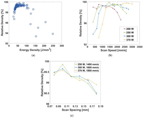 Below such a critical value (low-energy density), the material exhibits an incomplete melting of the powder layer, and some porosities remain as a matter of course, while above it (high-energy density), there are a lot of spherical gas pores. The layer thickness being constant, at a given laser power the energy density depends on scan speed v and scan spacing s; thus, the right combination of these parameters allows to obtain the optimal value of energy density and consequently of density of manufactured components. Figure 6b,c shows the relative density of components obtained with different laser power by varying the scan speed and scan spacing, respectively. Similar results were obtained by Read et al. [53] by studying the AlSi10Mg alloy.