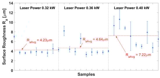 Surface roughness of three groups of samples printed by L-PBF with laser powers equal to 0.32, 0.36, and 0.4 kW (redrawn from ref. [94]).