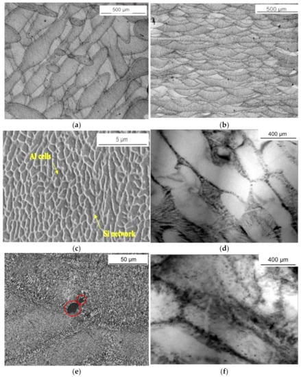 The Al grains inside the melt pools are elongated in the building direction, and each grain exhibits a finer substructure of cells decorated by eutectic (Figure 9c). The average size of the cells is about one order of magnitude lower than that of grains. Moreover, the material exhibits pores with different shapes and sizes (Figure 9e). As also observed by other investigators [110,111,112], Si atoms are present in the Al matrix above the concentration of equilibrium, and networks of entangled dislocations form in Al as the result of fast solidification (~107 °C/s), typical of the L-PBF process. The cells and grains present a consistent size, morphology, and texture from top to bottom of the printed parts [113]. The cyclic reheating of the material enhances diffusion, giving rise to the precipitation of different compounds depending on the specific composition of the alloy. As a matter of fact, this phenomenon is an intrinsic heat treatment due to the repeated thermal cycles. In addition, the high Mg susceptibility to evaporation leads to a lack of this element from some parts of the final component, with effects on the properties of the material.
