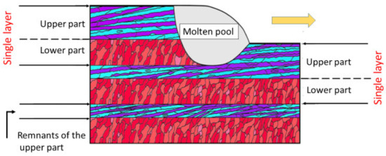Dong et al. [136] investigated the 7055 alloy produced by WAAM and evidenced that in a single-layer deposition, there are two types of columnar grains (one originated from the starting position and the other one from the bottom fusion lines), with different orientations. As shown in Figure 11, the grains originated from the starting position are partially remelted during the deposition of the subsequent layer, giving rise to a periodical microstructure.