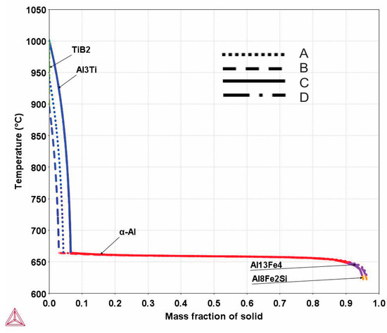 The Scheil simulation was performed based on the chemical composition of the grain refiners listed in Table 1. The simulation includes an explanation of all the phases that can occur in the experimental grain refiners. The Scheil results in Figure 1 show large differences in the mass fractions of the expected phases during the solidification of the grain refiners. For grain refiners A and B, the TiB2 phase is expected to solidify before the Al3Ti phase (marked blue in the Scheil diagram). For grain refiners C and D, the proportion of the Al3Ti phase is expected to be higher. The solidification process is the same for all grain refiners; only the number of phases and the solidification temperatures are different. Grain refiners C and D contain the highest amount of Al3Ti phase in equilibrium (Table 2), as expected due to the higher Ti content in the grain refiner. These Al3Ti particles do not play a role in the grain refinement of the aluminum alloys in the absence of TiB2 particles. Grain refiner D also contains the highest proportion of Al9Fe2Si (or Al13Fe4, depending on the Fe and Si content in the grain refiner, marked purple and orange in the Scheil diagram), which is due to a higher proportion of impurities, such as Fe and Si.