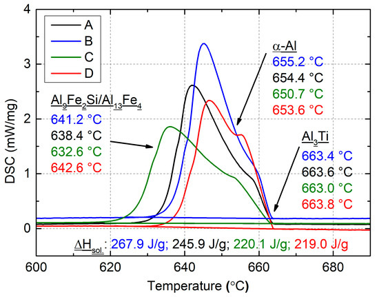 Figure 2 shows the results of the DSC analysis, obtained during cooling. From the DSC curves, the course of the solidification processes of various grain refiners was determined in order to establish a relationship between the phase transformation and the electrical resistivity results. The DSC cooling curves show clear differences between the grain refiners. The solidification temperatures of all characteristic phases (α-Al, Al3Ti, and Al9Fe2Si/Al13Fe4) varied between the studied grain refiners, confirming the different chemical compositions. The variation between the grain refiners was also evident in the solidification enthalpy, which was the lowest for grain refiners C and D. This indicates a higher content of impurities (non-metallic inclusions), which do not melt until 720 °C and are not such effective inoculants. In addition, the impurities can contaminate the TiB2 particles and reduce the grain refining performance of the grain refiners [24,25].