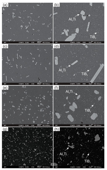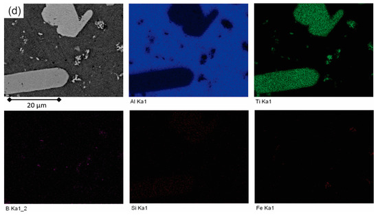 Figure 3a–h depict typical micrographs of grain refinement in the as-cast state. In Figure 3a,b, which show the Al-3 wt.% Ti-1 wt.% B alloy, large Al3Ti particles can be seen in a blocky- or flake-like form, which are not uniformly distributed in the matrix, whereas the smaller TiB2 particles are fragmented in between. Figure 3c,d show the Al-3 wt.%-Ti-1 wt.%-B alloy with quite differently shaped Al3Ti particles uniformly distributed in a flake-like form. Finally, for grain refiners C and D (Figure 3e–h), which represent the Al-5 wt.% Ti-1 wt.% B alloy, the shape of the Al3Ti particles changes from blocky to flaky when the Ti/B ratio is reduced. These findings also confirm EDS maps of elemental distributions of elements in the microstructure, presented in Figure 4.