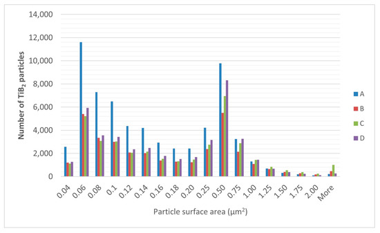 The Al3Ti and TiB2 particles were analyzed from multiple micrographs (48) using SEM, focusing on the size distribution, and the results are shown as the number of particles with respect to size (particle surface area) in Figure 5 and Figure 6. Since the size distribution of TiB2 particles in the grain refiners has a significant effect on the grain refining efficiency, grain refiner B showed the best results, although the others had more TiB2 particles with very small sizes (from 0.04–0.1 μm2). However, grain refiners A, C, and D also contained very large particles (0.25–1.0 μm2). The highest number of TiB2 particles was found in grain refiner D (41,857 per mm2), as also predicted by thermo-calc calculations, but due to the uneven size distribution and the highest content of Fe, Si, and other impurities, confirmed by DSC analysis, it is expected not to be the most efficient. Although grain refiner B contains a smaller amount of TiB2 particles (34,016 per mm2), its performance should be the best because the size distribution is the most uniform. Additionally, the impurity content is the lowest according to DSC analysis, which also results in the lowest electrical resistivity. The larger particles and the impurities such as Fe, Si, and inclusions cause more electron scattering by the matrix [15].
