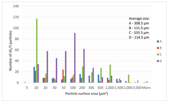 The different shapes of Al3Ti particles are shown in Figure 3a–h and can be caused by different growth mechanisms and processing conditions. Both insoluble TiB2 particles and soluble Al3Ti particles of appropriate size and shape are required for effective inoculation, with the TiB2 particles serving as a substrate for Al3Ti nucleation. Studies show that the number of Al3Ti particles added to the melt of Al-Ti-B grain refiners has a smaller effect on inoculation than the number of TiB2 particles [25], suggesting that grain refinement is primarily driven by TiB2 as a nucleation substrate, with Ti excess having secondary effects on the surface area of TiB2. However, optimal grain refinement also requires Al3Ti particles in appropriate concentrations and sizes. In this case, grain refiner B exhibits the most uniform size distribution of Al3Ti particles, and grain refiners C and D show the largest deviations (Figure 6).