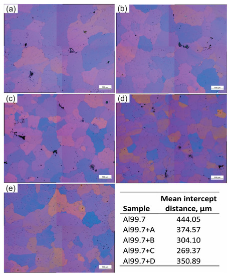 Micrographs taken in a polarized light for base aluminum alloy Al99.7 and grain-refined samples using grain refiner A (b), B (c), C (d), and D (e). Table in this figure is presenting the mean intercept distance in µm for micrographs presented in (a–e).