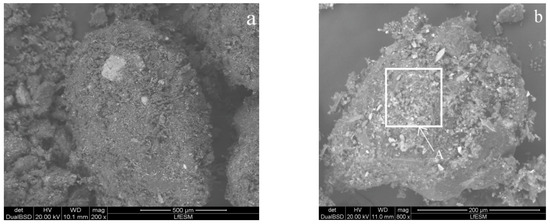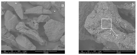 (a) SEM image of the calcined petroleum coke sample, magnification 200×; (b) SEM image of the calcined petroleum coke sample with a spot of the EDS spectrum (CPC), magnification 800×.