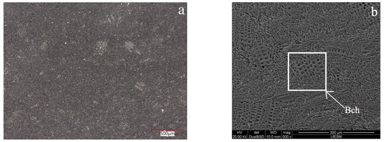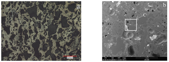 Images of the coke sample. (a) Optical image of the coke sample, magnification 100×; (b) SEM image of the coke sample with a spot of the EDS spectrum (C), magnification 100×.