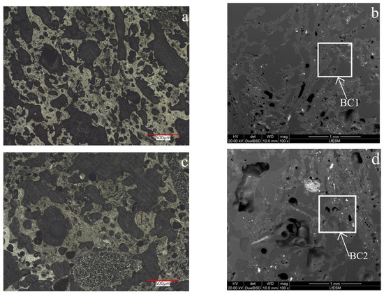 Biochar particles were the most porous material (Figure 3), which was confirmed by the highest BET SSA value (see Table 4). The coke sample was a porous-fractured material consisting of pores, microcracks, and a hard carbon matrix with organic and inorganic inclusions (Figure 4b). It is evident from Figure 4b that this was a heterogeneous material composed of organic carbon, mineral substances, and many pores. The microstructures of BC1 (Figure 5a,b) and BC2 (Figure 5c,d) did not differ significantly. These were visually characterized by the presence of large pores, unlike the conventional coke presented in Figure 4a,b.