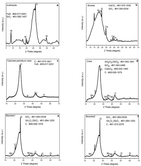 In the anthracite sample (Figure 6a), quartz and muscovite [31] were found. In the biochar, quartz and calcite (Figure 6b) were identified. Quartz and pyrite were found for calcined petroleum coke (Figure 6c). In addition, a weak peak at approximately 43°2θ was detected in the coke, BC1, and BC2 samples and assigned to graphite (Figure 6d–f). For coke, BC1, and BC2 (Figure 6e,f), the peak around 16.0°2θ was specified as mullite (3Al2O3·2SiO2), showing that the predominant crystalline phases were quartz and mullite.