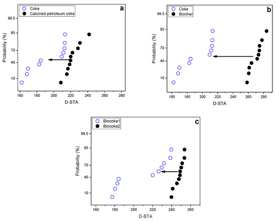 (a) Probability distribution of the D-STA parameter of coke and calcined petroleum coke; (b) coke and biochar; and (c) biocoke samples. The arrow indicates a statistically significant difference.