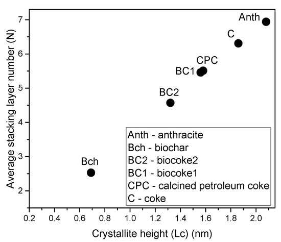 The lattice distance d002 for anthracite, calcined petroleum coke, coke, and BC1 was 0.35 nm and 0.37 nm for BC2, which was slightly higher (Table 6). Biochar was characterized by the highest value of d002 (0.45 nm). The largest value of the carbon crystallite height was characterized by anthracite (2.08 nm) followed by coke (1.86 nm), and the lowest by biochar (0.69 nm). The number of the crystal stacking layers was larger (6.94) in anthracite than in the other four coke samples.