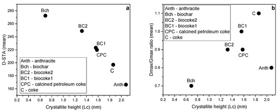 Relationship between the parameters of crystallite height (Lc) and selected Raman parameters. (a) Relationship between crystallite height (Lc) and D-STA (mean). (b) Relationship between crystallite height (Lc) and the Dmax/Gmax ratio (mean).