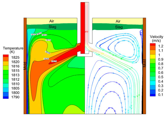Figure 3 shows the vector figure of the flow field, temperature field, and phase distribution, the blue region is the shell (the steel liquid volume fraction was less than 0.9). The liquid steel level near the mold wall was higher than that on the side of the SEN port, and the thickness of the slag layer near the SEN port was higher than that near the mold wall. After the liquid steel was jetted from the SEN port, upper and lower backflows were generated, there was a small backflow near the shell with a speed of 0.1 m/s. The fluctuation of the liquid level was caused by upper backflow. The superheat of the molten steel gradually dissipated with the flow, the molten steel temperature near the slag layer was 1810 K. The performance of the slag layer was determined by the transport of the upper flow, and the upper flow provided heat for the melting of the slag. The flow pattern of molten liquid was in good agreement with those previous results by Ho and Yang [24,25].