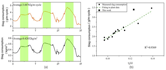 Figure 4. Comparison of slag consumption: (a) transient slag consumption, (b) comparison of predicted slag consumption with measurements from Shin et al.’s data from [26].