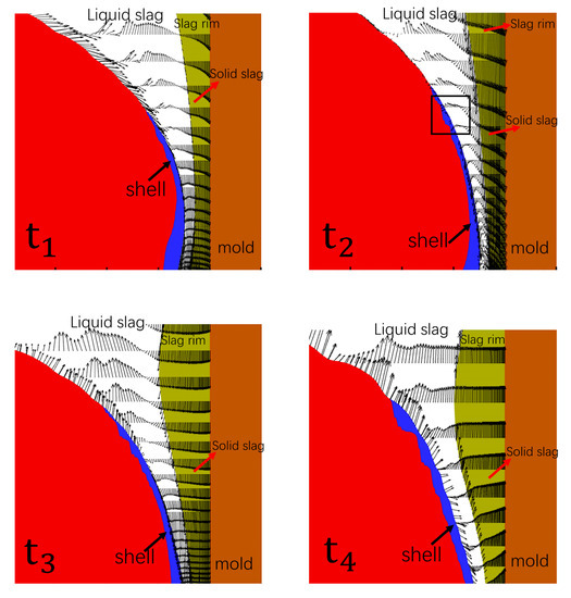 The transient flow behavior of slag is shown in Figure 7. The blue area is the shell, the red area is the molten steel, and the initial meniscus is the initial steel–slag interface. During the t n (i.e., from t1 to t3) and the moment when the mold moved to its highest position (t4), a backflow of slag occurred near the meniscus. During the t n , a backflow of slag mainly occurred near the initial shell, while a backflow of slag occurred near the slag rim at t4. The backflow of slag during the t n was caused by the continuous squeezing of the slag channel by the slag rim, which moved downward with the mold. However, at t4, it was due to the slag rim moving upward with the mold, and the slag near the slag rim flowed upward with the slag rim under the action of inertia. During the whole oscillation period, most of the slag in the slag channel infiltrated downward.