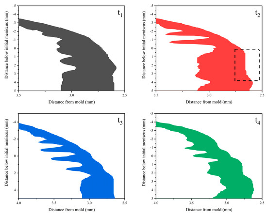 Figure 8 showed the evolution of the shell profile at different oscillation stages. At t2 (i.e., the middle of the t n ), the front of the shell showed an obvious depression, the depression was the initial oscillation mark. Combined with Figure 7, it can be seen that at this moment, the slag was squeezed out from the slag channel into the slag pool, and the backflow of slag impacted on the surface of the initial solidified shell, thus causing the formation of the oscillation mark. The shell was gradually pulled down at the casting speed. This indicated that oscillation marks were formed in t n ; hence, the oscillation marks can be reduced by adjusting the t n .