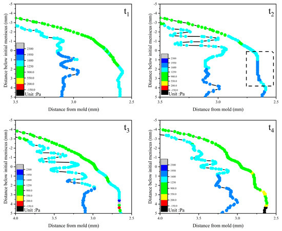 Figure 9 exhibited pressure variation of the shell surface at different oscillating stages. The shell pressure gradually increased from top to bottom, and the shell gradually thickened. During the t p (i.e., from t3 to t4), the pressure of the shell surface decreased. During the t n (i.e., from t1 to t3), the pressure increased and then decreased. At t4 (i.e., the middle of the t p ), the pressure of the shell surface was the lowest, with 1625 Pa. At t2 (i.e., the middle of the t n ), the pressure of the shell surface was the highest, with 1854 Pa. Combined with Figure 7, the sudden increase in pressure at t2 was caused by the strong backflow of the slag, so the depressed oscillating marks were formed on the surface of the shell as shown in Figure 8.