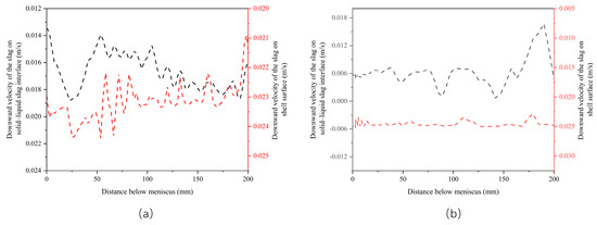 The downward velocity of the slag on the solid–liquid slag interface and the downward velocity of the slag on the shell surface are demonstrated in Figure 13. In the presence of t n , the downward velocity of the slag on the solid–liquid slag interface and the downward velocity of the slag on the shell surface fluctuated sharply, the velocity increased gradually with the increase in the distance from the meniscus, the downward velocity was between 0.013 and 0.019 and 0.021 and 0.024 m/s, respectively. In the case without t n , the downward velocity of the slag on the solid–liquid slag interface and the downward velocity of the slag on the shell surface smoothly fluctuated, the downward velocity was between 0.00063 and 0.01673 and 0.02278 and 0.02538 m/s, respectively. The downward velocity of the slag on the solid–liquid slag interface and the downward velocity of the slag on the shell surface depended on the oscillation velocity of the mold, the solid slag thickness, and the casting speed.