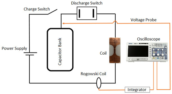 Approximate circuit diagram of the electromagnetic joining (EMJ) process. The Rogowski coil and voltage probe are attached to the capacitor bank to provide the process metrics.