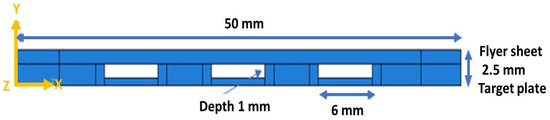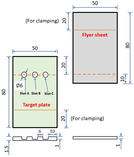 AA5052 sheets of 1 and 1.5 mm thickness were used for the flyer and target materials, respectively. The properties of the material were examined experimentally within the laboratory: the tensile strength of the sheet is 232 MPa, with an elastic modulus of 70.3 GPa and 17% elongation at the break. Dimensions of the workpieces are shown in Figure 2. On each target, three slots of a 6 mm diameter and 1 mm depth were made using the CNC milling machine, to provide the standoff distance for the flyer travel. The distance between the slots was 6 mm as per the gauge length of the coil, and both sheets were clamped up to a 10 mm edge distance from the edges.