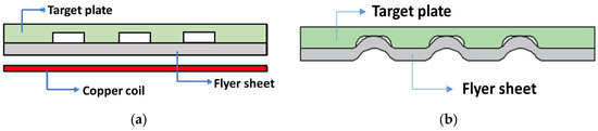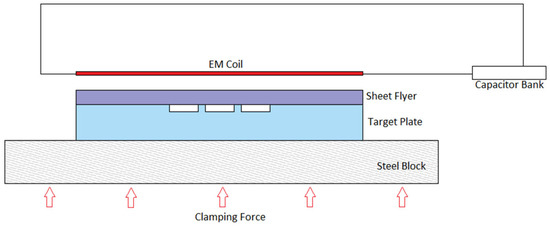 The rapid forming and clinching of the metals not only reduce the cycle time but also induce the local strain hardening of the joint interface and its periphery. At the time of the discharge, the stored electrical current in the capacitor is released during tens of microseconds (µs) through the coil or inductor, as shown in Figure 1. The excited coil generates a Lorentz force to drive one sheet metal (flyer) towards the stationary material (target). The joint provides excellent mechanical properties as the material is usually strengthened by local plastic deformation of the base metals without generating HAZ [11,12].