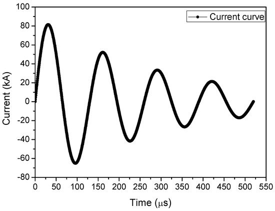 A current waveform for a multi-spot weld of an 8 kJ discharge energy.