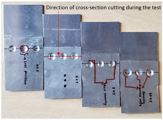 - When the discharge energy was lower than 8 kJ, an improper joint was obtained due to insufficient forming of the flyer sheet. When it was increased beyond 9 kJ discharge energy, shear cracks were observed at all three spots, indicating the excessive use of the energy.