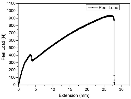 The peel test was carried out and the load-displacement curve of the test is shown in Figure 13. After it has reached about 400 N, there is a sudden drop in value and a further increase in the load value to the maximum of about 950 N. The maximum value identifies a proper joint leading to higher plastic deformation, which usually occurs in a high strain rate forming by joining processes. It was also seen that the sample tested at 8 kJ failed on the base metal, leaving behind the unfailed spot joints, as shown in Figure 12.