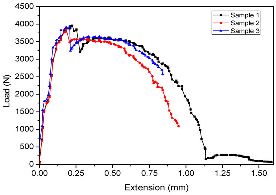 The schematic of the lap-shear test arrangement is shown in Figure 14. Figure 15 depicts the load versus displacement data during the lap-shear test. For statistical accuracy, three samples were generated and tested. The load-displacement curves show decent reproducibility of the samples in terms of the peak load and elongation until the failure. The first peak is seen at about a 0.22 mm extension with a load value of 3950 N, and the second peak is observed at about 0.27 mm and 3600 N before the load drops. This is attributed to the fact that, during the second peak, the centre spot being relatively weak, started failing, and the total failure was delayed by the adjacent spots ”A and C”.