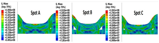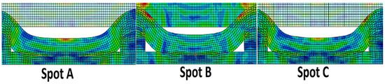 The Von Mises stress contour is recorded at the 64 µs time step according to the total time of the first positive half of the current profile. The first part of the positive increasing pressure curve is responsible for impact and joining of the flyer sheet with the target plate. The later part of the pressure curve is used to hold the material in the deformed position, which reduces the spring-back effect of the material. The Von Mises stresses contour of spot B and spot C suggests that more stress is at the neck of the flyer sheet and near the milled edge of the target plate due to stress concentration during the deformation of the neck. Among the three spots, the Von Mises stress magnitude for spot A, B and C was 160, 84, and 148 MPa, respectively, at the spot centre at the interface of two sheets. Spot B has the lowest stress corresponding to the stress contour of the joint due to relatively less impact pressure, as shown in Figure 18.