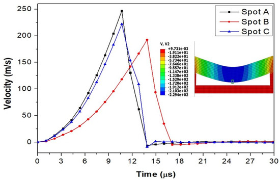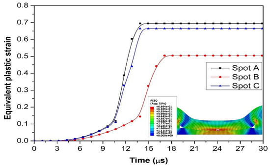 As the induced stress exceeds the yield point of the material and enters the elasto-plastic region, elastic and plastic strains play a significant role. Elastic strain is responsible for material deformation recovery and plastic strain increases the strength of the material by strain hardening. Equivalent plastic strain for the highlighted lower mid element of the flyer sheet is calculated for all three spots as shown in the small window of Figure 19. In the graph, the maximum equivalent plastic strain for the material is between 0.50 and 0.69 during 13 to 17 µs, and later, after the joining of plates, the equivalent plastic strain becomes constant. The maximum values of the equivalent plastic strain for spot A, B, and C were 0.69, 0.50, and 0.66, respectively. Spot B gives less equivalent plastic strain due to relatively less stress than spots A and C. The equivalent plastic strain and impact velocity are plotted up to 30 µs as there is no change in the magnitude after this time.