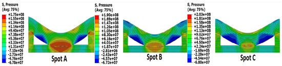 Figure 20 shows the impact pressure at the interface when the flyer sheet is just striking with the target plate. Different spots show different impact pressure. The impact pressure obtained at the interface of spots A, B, and C was 150, 128 and 142 MPa, respectively. Spot B has less impact pressure due to less impact velocity than the adjacent spots.