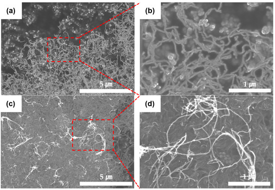 SEM micrographs of (a,b) as-received MWCNTs (length: 100 µm) and (c,d) chopped MWCNTs (length: 5–10 µm).