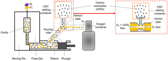 Figure 2 shows a schematic of the experimental setup used for the fabrication of the composites using ORDC. It consisted of the mold with the cavity, gate and runner part, and O2-supplying system connected to the sleeve with the pouring inlet [23,24]. A container attached to the O2-supplying tube supplied CNTs via the Venturi effect when O2 was supplied.