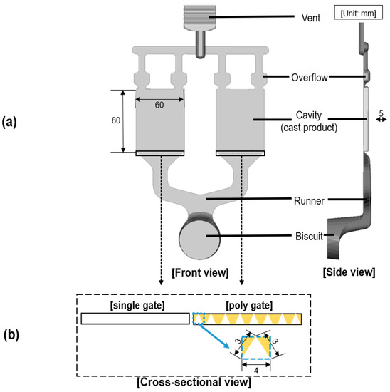 Schematic of casting design of mold: (a) front and side views of casting design and (b) cross-sectional view of single gate and poly gate of mold.