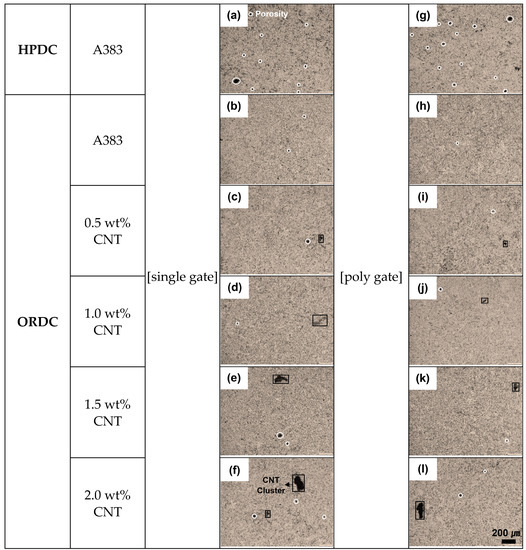 The 0.5–2.0 wt% CNT-added composites cast using a single gate and poly gate by using ORDC (Figure 5c–f,i–l) showed some CNT clusters and additional micropores compared to the A383 alloy cast using a poly gate by using ORDC. Moreover, the amount of micropores tended to increase when using a single gate and increasing the CNT addition.