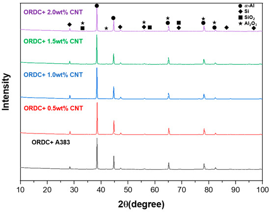 Figure 8 shows the XRD pattern of the A383 alloy and CNT-added composites. Both showed the Al, Si, SiO2 and Al2O3 phases, but all composites did not show the Al4C3 phase, indicating that CNTs were not carbonized during fabrication.
