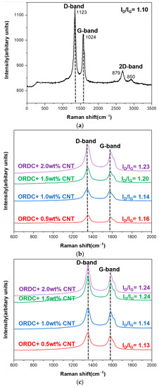 Raman spectroscopy analysis of (a) as-received CNTs and 0.5–2.0 wt% CNT-added composites cast using a (b) single gate and (c) poly gate by using ORDC.