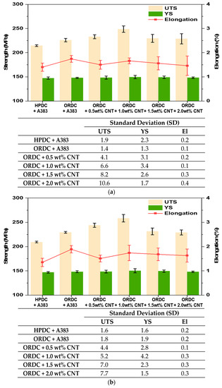 Tensile test results of A383 alloy and 0.5–2.0 wt% CNT-added composites cast using (a) a single gate and (b) poly gate by using HPDC and ORDC.