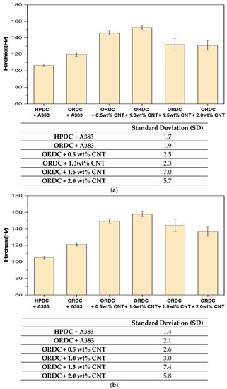 The hardness measurement result of the A383 alloy and 0.5–2.0 wt% CNT-added composites is shown in Figure 12. When using a single gate by using ORDC (Figure 12a), the addition of 1.0, 1.5 and 2.0 wt% CNT resulted in hardness values of 152.8 ± 2.3 Hv, 132.2 ± 7.0 Hv and 130.9 ± 5.7 Hv, respectively; by contrast, the hardness value of the A383 alloy was 119.6 ± 1.9 Hv.