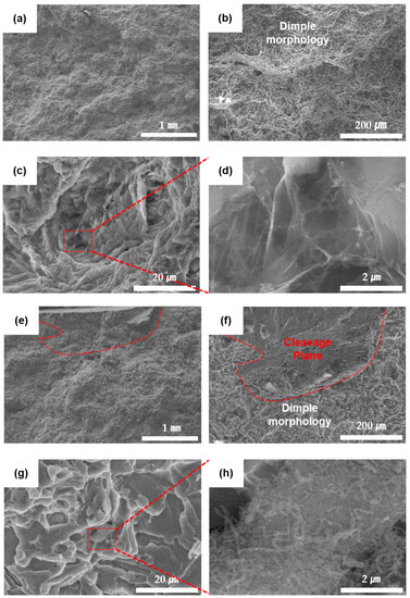 Figure 13 shows fractographic images of the specimens fractured by tensile tests (Figure 11). The 1.0 wt% CNT-added composite cast using pa oly gate (Figure 13a–d) exhibited a large number of dimples with some microvoids that represented a ductile fracture; this was attributed to their better ductility. However, the 2.0 wt% CNT-added composite cast using a poly gate (Figure 13e–h) exhibited cleavage planes with microvoid coalescences associated with brittle fracture. The CNT-added composites have a tendency to become more brittle as CNT clusters increase with the CNT addition amount; this tendency is in good agreement with the trend of the tensile test results shown in Figure 11.