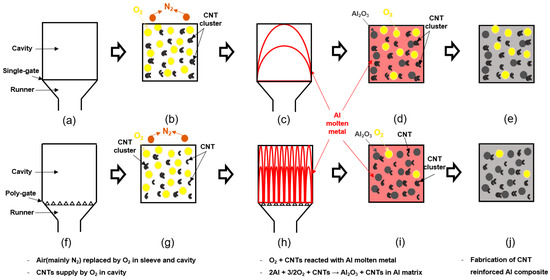 Figure 14 shows a schematic of the fabrication of CNT-added composites cast using a single gate and poly gate by using ORDC. First, O2 was supplied to replace the air (mainly N2 gas) in the cavity and sleeve; after the air was fully replaced by O2, CNTs were added into the cavity by the Venturi effect produced by the O2 supply pressure (Figure 14a,b). Then, molten Al was filled into the cavity with one filling stream pattern formed using a single gate, where it reacted with O2 to form Al2O3 and finally solidified (Figure 14c). CNTs generally have a relatively large contact angle of 140–160° with Al; thus, they repel each other, resulting in the reduced dispersion of CNTs in Al. However, Al2O3 formed by the rapid reaction between molten Al and O2 gas in ORDC has a relatively low contact angle of ~37° with CNTs; owing to the better wettability between Al2O3 and CNTs, CNTs are distributed around Al2O3 (Figure 7a), resulting in improved dispersibility of CNTs and grain refinement in the composite [42,43,44]. Some residual O2 that did not participate in the Al2O3 reaction remained as internal gas porosities, and the small total amount of Al2O3 reduced the CNT dispersibility. This left a clustered form and reduced nucleation sites owing to the decrease in CNT dispersion, in turn reducing the grain refinement effect (Figure 14d,e).