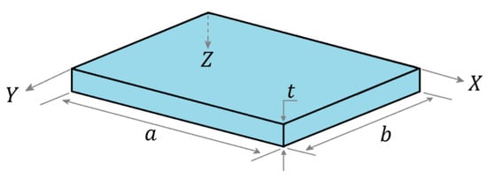 First, the verification and validation of the proposed computational model were performed. Then, through the verified and validated computational model, the case study was carried out. Figure 1 shows the main dimensions of a thin plate: a is its length, b is its width, and t is its thickness.