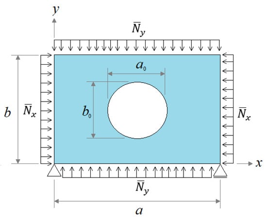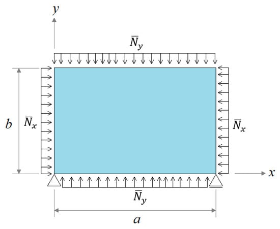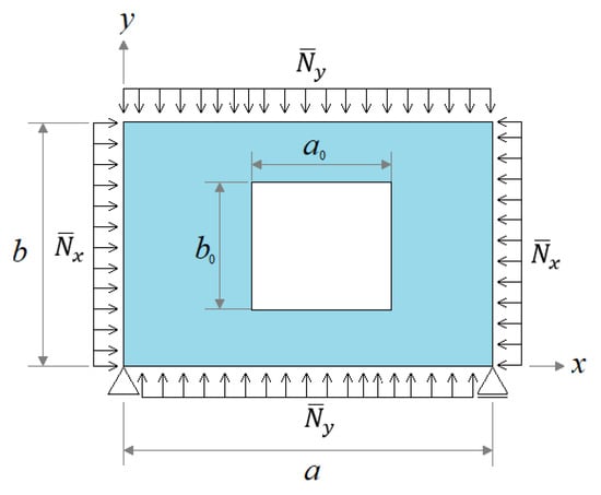 Thin plates are commonly used in aircraft structures, ship hulls, or automobiles, and are frequently exposed to biaxial compressive loads in their plane. In several industrial or engineering applications, they are required to withstand different load types, which may be in-plane (compression, tension, shear, etc.) and/or out-of-plane (bending, torsion, etc.) []. In addition, due to uniaxial or biaxial compressive loads, the thin plates can suffer an unwanted phenomenon known as buckling, which can be aggravated if the compressive loads are combined with lateral loads, causing a significant reduction in the buckling resistance of the structure [,].