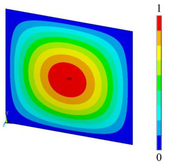 Through the analysis of Figure 3, it is possible to visualize a configuration of the formed half-wave buckling, in which the blue color indicates regions with no displacement and the red color represents the maximum deflection that occurred on the plate. Thus, as expected, one can see that during the elastic buckling, the greatest displacement occurs at the center of the plate.