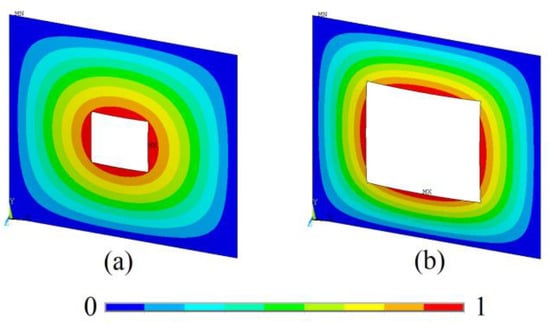 In Figure 5, as in Figure 4, a half-wave was formed due to the elastic buckling, ranging from no displacement in the plate edges (in blue color) and the maximum deflection in the hole edges (in red color). In addition, it can be seen that by increasing the size of the square hole, the regions with greater deflections are concentrated in the center of the edges of the holes.